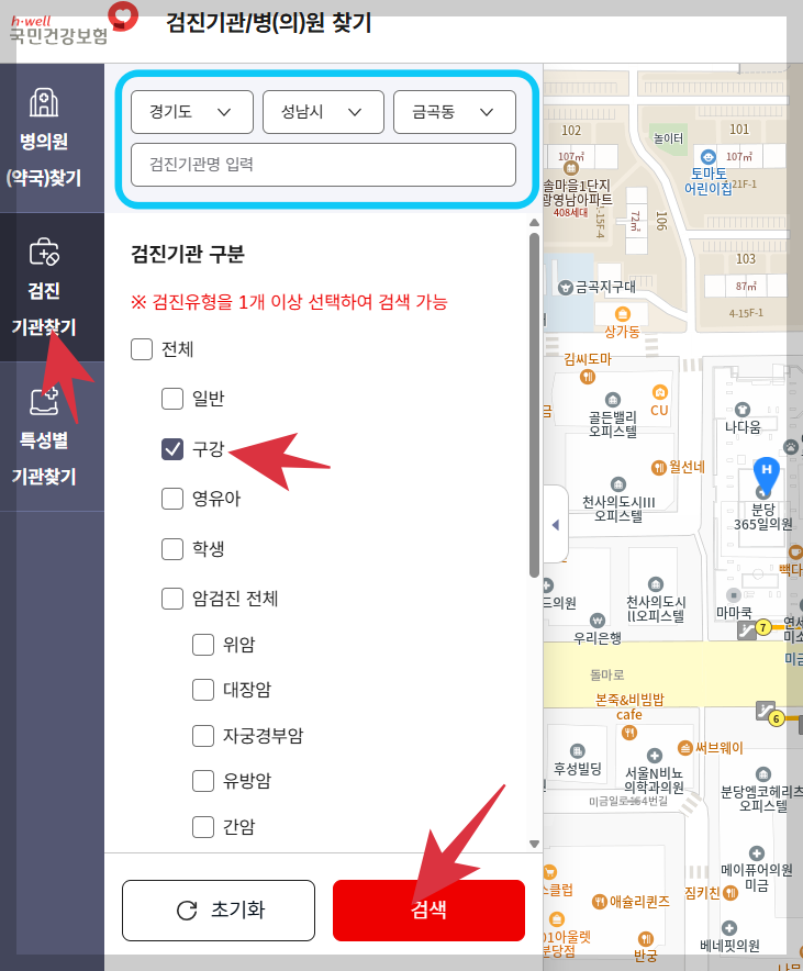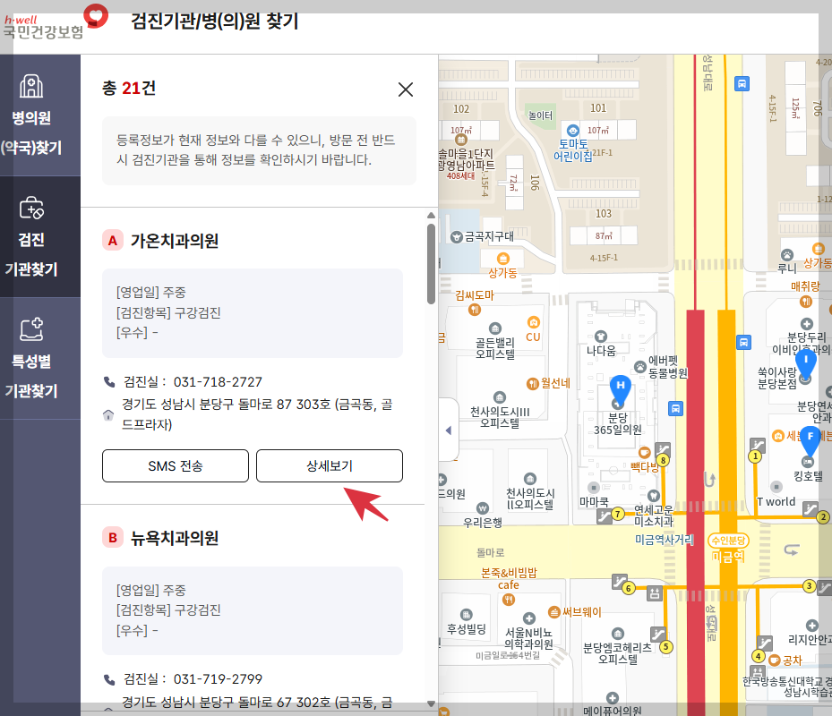 검색 결과는 위와 같이 지도와 함께 검진기관이 표시되며,