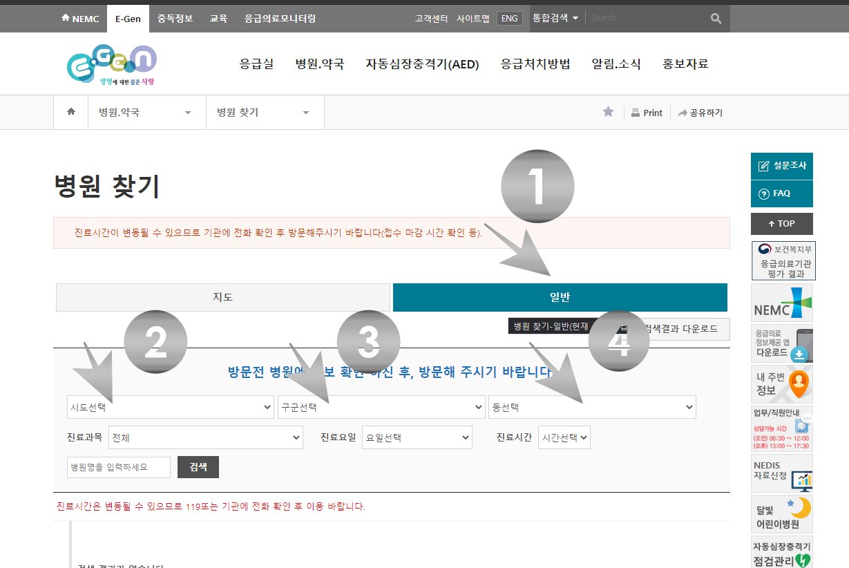 응급의료포털사이트를 이용하여 진료 과목별 병원 찾기