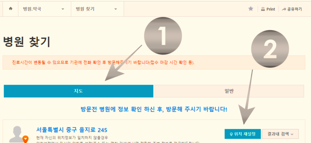 병원 찾기에서 현재 자신의 위치를 기반으로 병원을 찾을 수 있습니다.