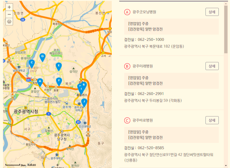 검색 결과는 위와 같이 지도와 함께 검진기관이 표시되며, 검진기관 우측의 상세 버튼을 클릭하며 의료기관의 일반정보와 검진항목, 검진시간, 점심시간, 건강검진 의료장비 등을 확인할 수 있습니다.