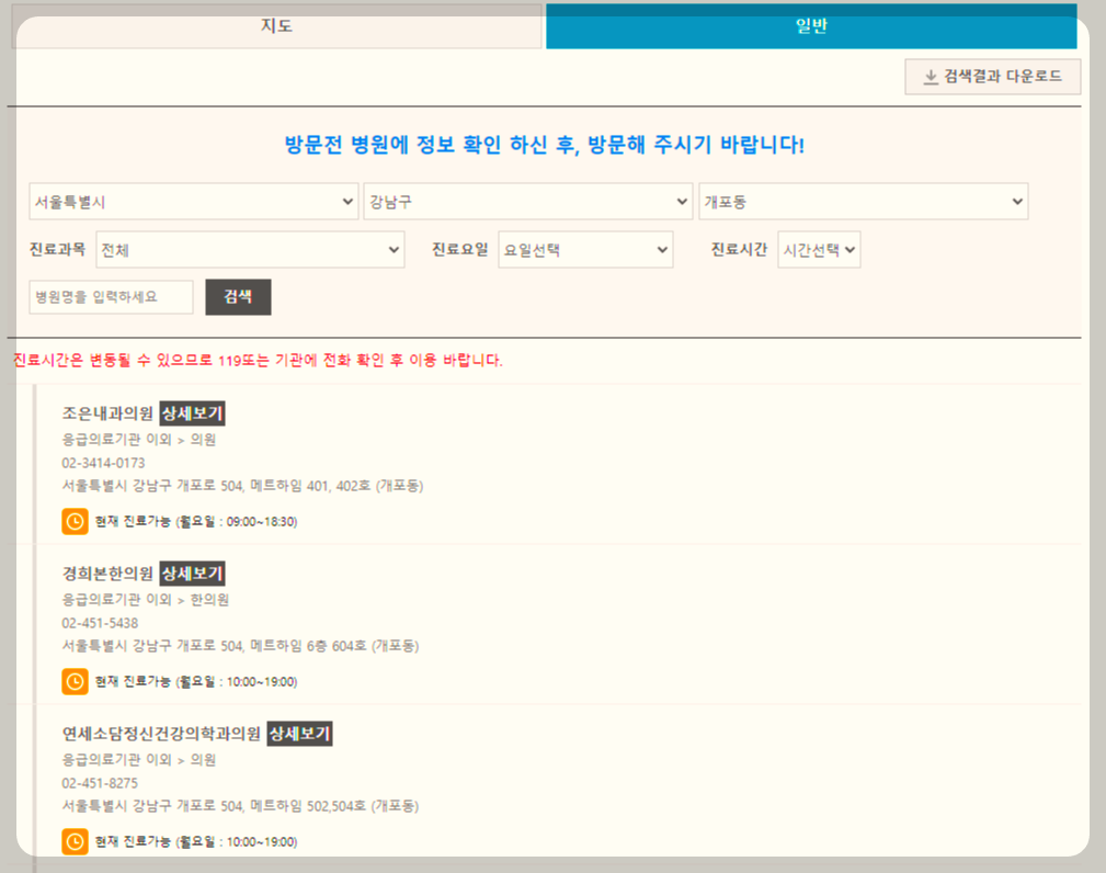 실시간 이용 가능한 의료기관 검색 결과는 위의 사진처럼 검색됩니다.
